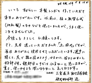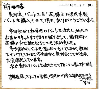 前略 先日は、バット工房「匠」様より硬式木製バットを購入させて頂き、ありがとうございました。今回初めて私専用のバットを注文し、地元のお店からネットまで隅々を探り巡って、最終的に匠様にお世話になることを決めました。多少重めのバットを選んだつもりでしたが、数回スイングしてみると不自由なく振り抜くことが出来、大変満足しています。次は素振りバットを注文させて頂こうと考えております。吉森様、スタッフの皆様、迅速かつ丁寧な対応ありがとうございました。草々