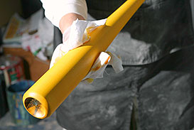 バットの塗装は、まずハケで着色をし、スプレーガンで塗料の付着を行います。